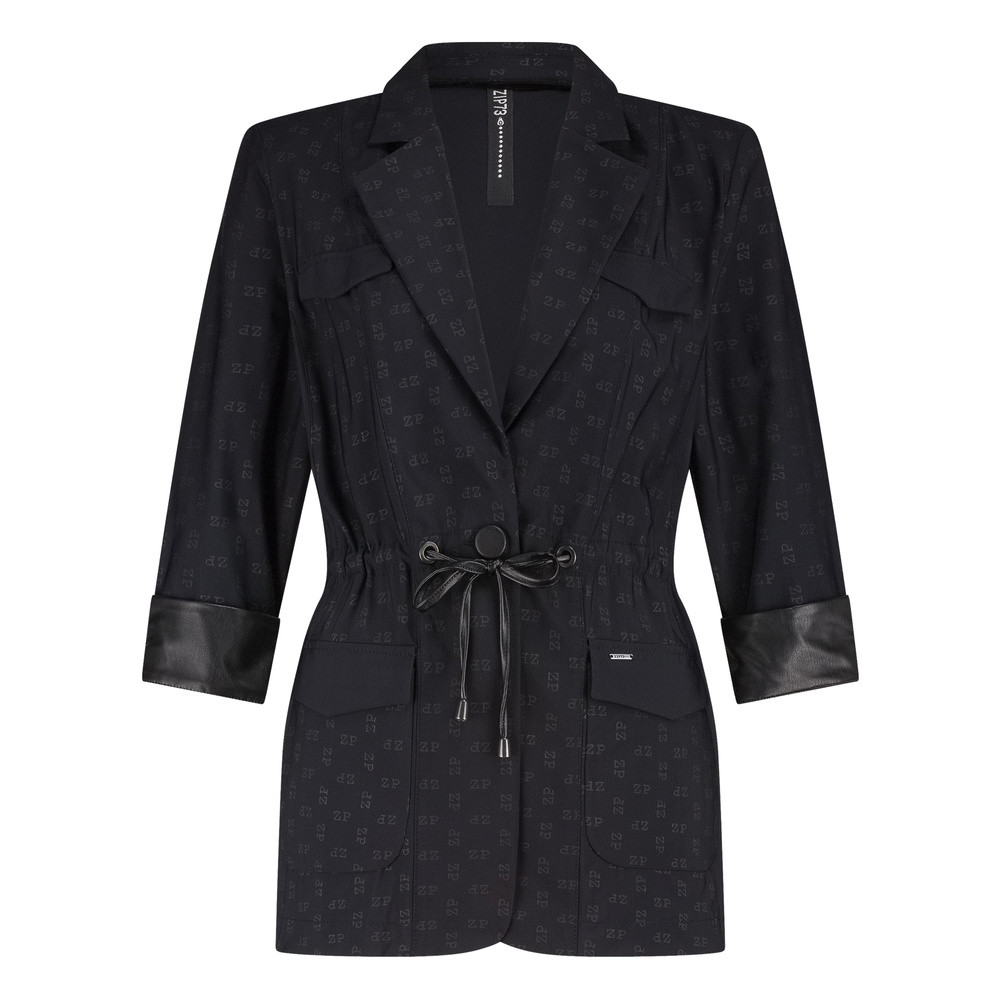 Maak een krachtig fashionstatement met deze zwarte blazer van ZIP73. De stijlvolle all-over logoprint geeft de blazer een eigentijdse en luxueuze uitstraling, terwijl de leren details zorgen voor een stoere twist. De subtiele omslagen van leer aan de mouwen en de bijpassende leren ceintuur in de taille accentueren je silhouet op elegante wijze.