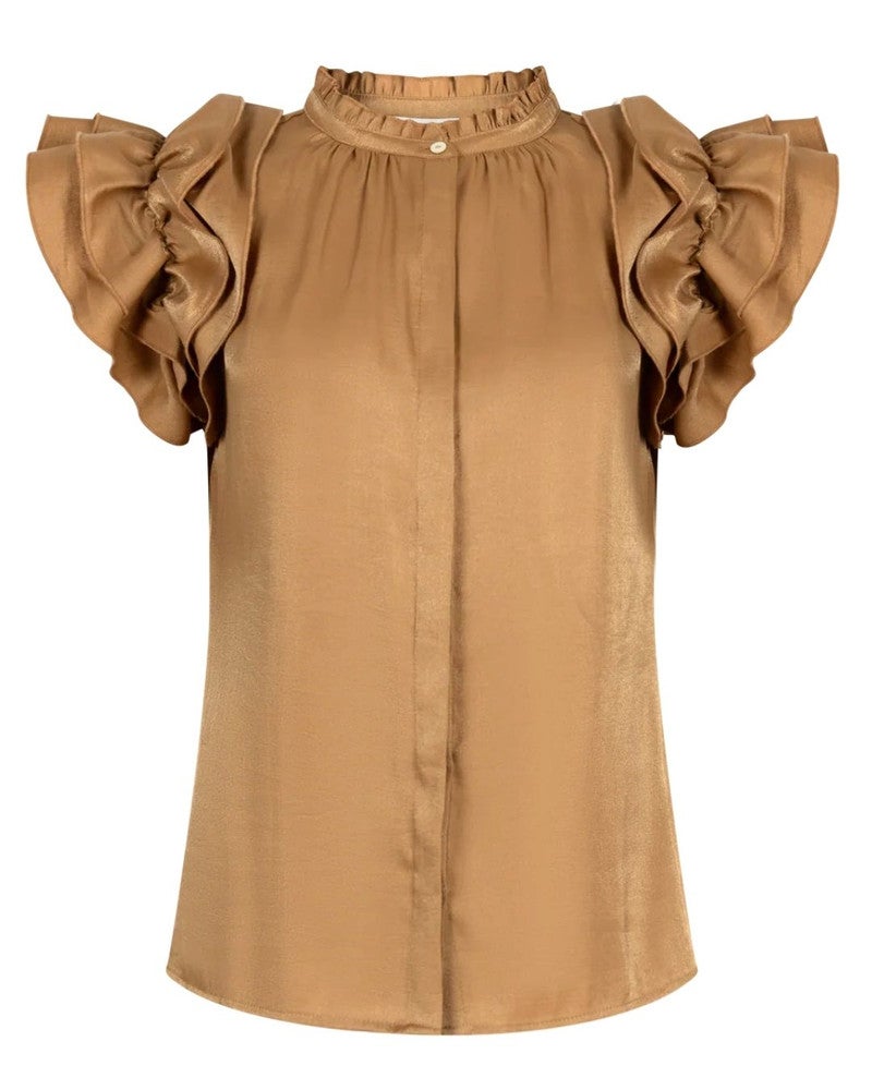 De Aaiko Gezana Top VIS 355 is een elegante blouse die direct een vrouwelijke en verfijnde uitstraling geeft. Het soepelvallende materiaal met subtiele glans zorgt voor een luxe gevoel, terwijl de opstaande kraag met sierlijke ruches en de speelse ruffles op de schouders een modieuze touch toevoegen. De verborgen knoopsluiting aan de voorkant maakt de top netjes afgewerkt en geschikt voor verschillende gelegenheden. Deze veelzijdige dames top is perfect te combineren met de bijpassende Aaiko Cecilia Pants Shine VIS 355 voor een complete, stijlvolle outfit. Dankzij het tijdloze ontwerp en de hoogwaardige stof is de Aaiko Gezana Top ideaal voor zowel werk, feestelijke gelegenheden als een chique casual outfit. Een absolute must-have voor dames die houden van comfortabele, stijlvolle kleding met elegante details en een subtiele luxueuze uitstraling. Combineer met de Cecilia broek van Aaiko voor een matching set.