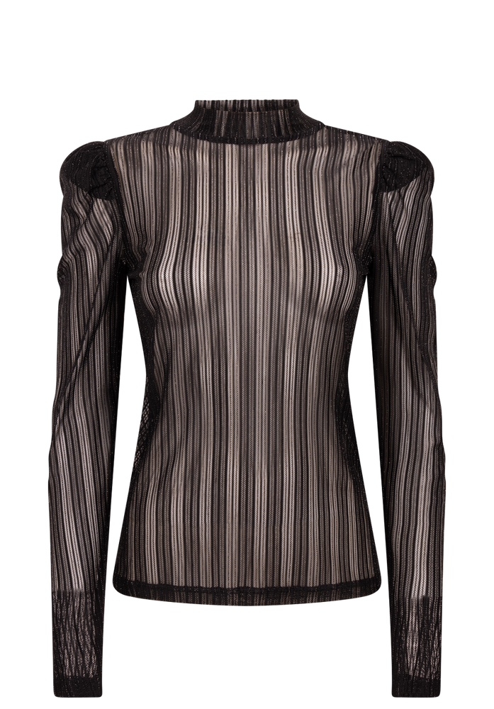 De Ivona Mesh Top van Aaiko in het zwart is een echte eyecatcher voor elke gelegenheid. Deze top is gemaakt van een zachte, transparante meshstof met verticale glitterstrepen die een feestelijke glans geven. De hoge hals en subtiele pofmouwen zorgen voor een stijlvolle, vrouwelijke uitstraling, terwijl de aansluitende pasvorm je figuur mooi accentueert. Perfect te combineren met een elegante pantalon of rok voor een avondje uit. Het model is 175cm en draagt een 36.