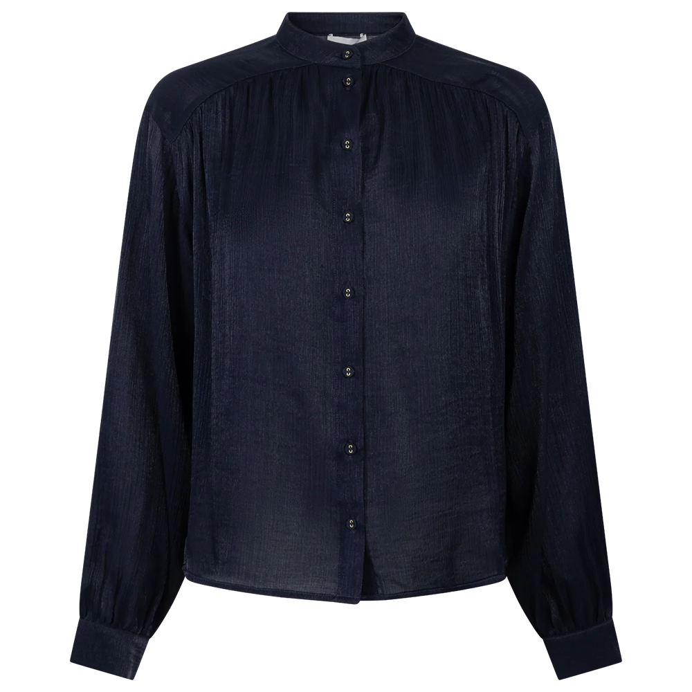 De Liv Blouse straalt een verfijnde elegantie uit, perfect voor zowel kantoor als een dineravond. Het semi-transparante materiaal heeft een subtiel glanzend effect dat je look automatisch stijlvolle allure geeft. De opstaande kraag met knoopje zorgt voor een moderne en chique touch, terwijl de zachte plooitjes bij de schouders een luchtige en vrouwelijke uitstraling toevoegen. Dankzij de losvallende pasvorm zit de blouse comfortabel, zonder dat je inlevert op klasse.