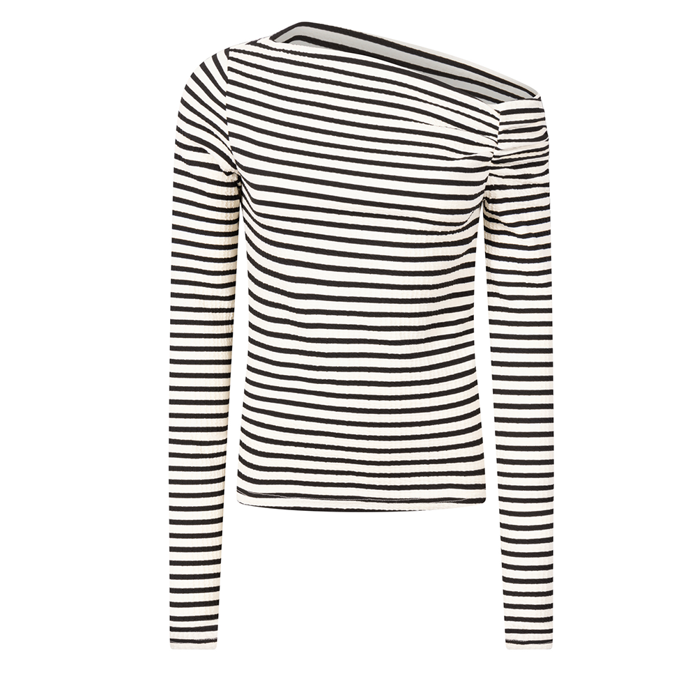 De Aaiko Lumia Stripe PES 202 in off white is een stijlvolle top gemaakt van 95% polyester en 5% elastaan. Deze top heeft een elegante uitstraling door de subtiele strepen en biedt een comfortabele pasvorm. Doordat een mouw lager uitgesneden is, wordt de top een stuk speelser. Perfect voor een casual maar verfijnde look die makkelijk te combineren is met andere kledingstukken.