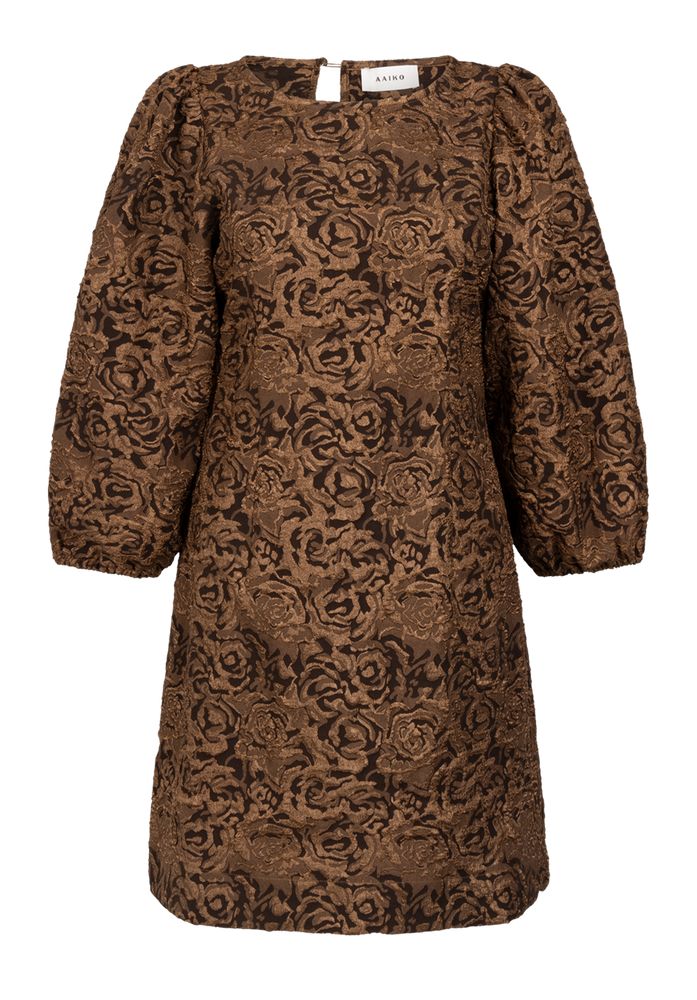 De Nicolette jurk in een warme goudbruine tint van Aaiko is een elegant en opvallend kledingstuk dat perfect combineert met zowel casual als feestelijke looks. Het jacquardmateriaal met bloemenreliëf geeft de jurk een luxe uitstraling, terwijl de ballonmouwen met elastische boorden een speels en vrouwelijk accent toevoegen.