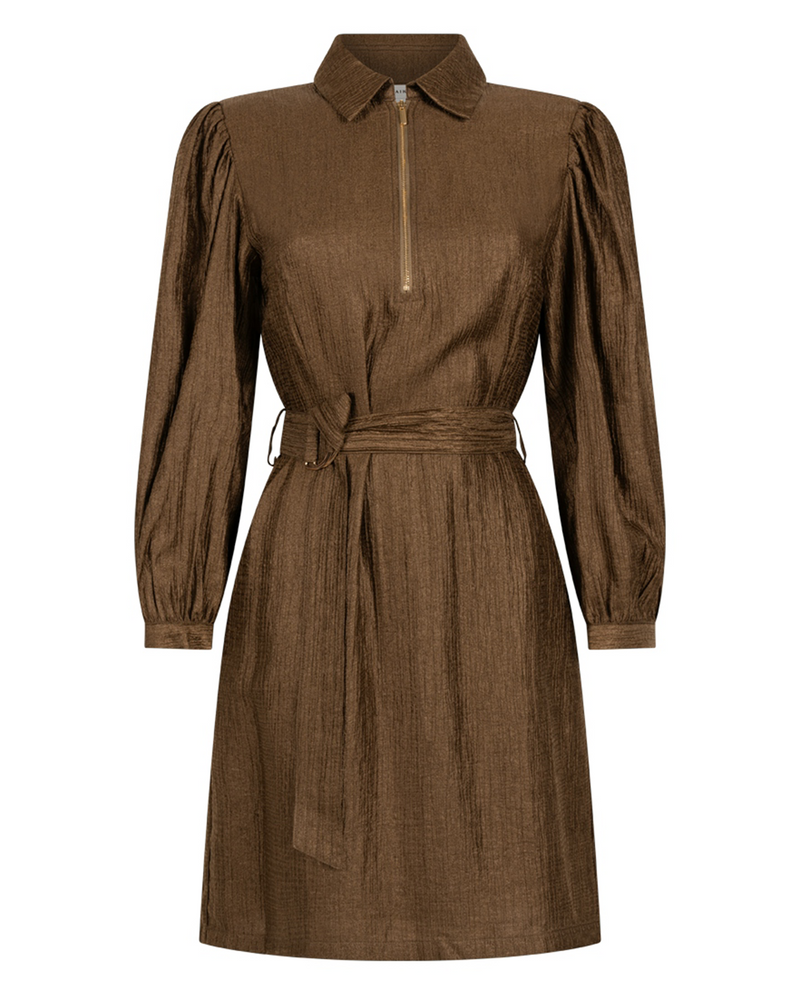 Een opstaande kraag met ritssluiting zorgt voor een moderne touch, terwijl de volumineuze mouwen met elastiek bij de pols het geheel een trendy en stijlvolle uitstraling geven. De combinatie van klassieke lijnen met eigentijdse details maakt de Semira jurk veelzijdig: draag hem naar een bruiloft, diner of een bijzondere feestelijke gelegenheid.