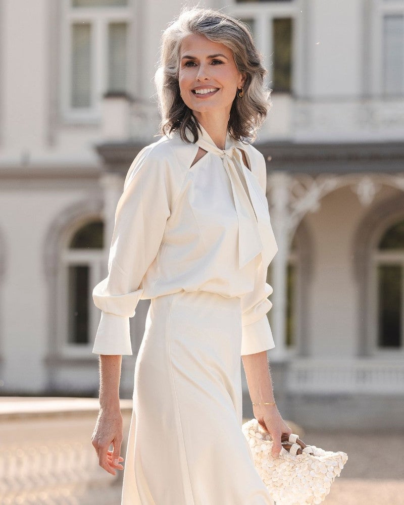De Accentil Alix blouse is een verfijnde dames blouse die moeiteloos comfort en stijlvolle elegantie combineert en een onmisbare toevoeging vormt aan je garderobe. Dit veelzijdige item heeft een tijdloze snit en een zachte, hoogwaardige stof die prettig draagt gedurende de hele dag. Dankzij het subtiele design is de Accentil blouse ideaal om te dragen onder een blazer voor een chic zakelijke look, maar hij komt ook prachtig tot zijn recht in een casual outfit met jeans of een pantalon. De blouse straalt een moderne en vrouwelijke uitstraling uit, waardoor je hem kunt stylen voor zowel werk als vrije tijd. Met zijn flatterende pasvorm en doordachte details biedt deze Accentil blouse de perfecte balans tussen comfort en modebewust design. Of je nu kiest voor een dagelijkse outfit of een meer geklede combinatie, de Accentil Alix blouse geeft je look een verfijnde touch en tijdloze klasse.