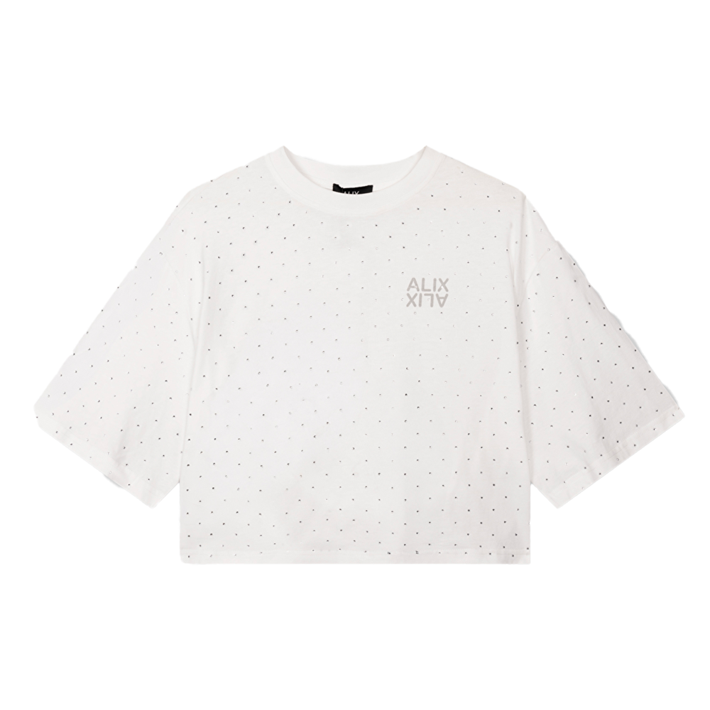 Voeg een edgy touch toe aan je outfit met dit cropped T-shirt van Alix The Label. Het T-shirt is gemaakt van een comfortabele jersey stof die heerlijk zacht aanvoelt op de huid. De all-over studs geven het shirt een stoere, speelse uitstraling, terwijl het "ALIX XILA" artwork op de borst subtiel de handtekening van het merk laat zien. Dankzij de cropped pasvorm is dit shirt perfect te combineren met een high-waist jeans of rok voor een trendy, casual look met een rauw randje. Het model is 176cm en draagt een 36.