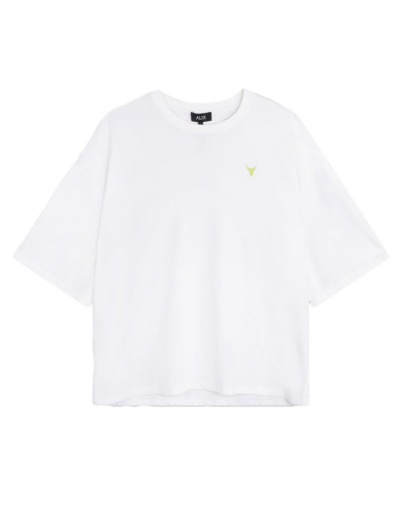De ALIX The Label The Label T‑Shirt is een tijdloze basic met een frisse uitstraling die in elke garderobe past. Dit Alix The Label T-shirt heeft een relaxed model en een subtiel, clean design waardoor hij een perfecte basis vormt voor talloze outfits. De kleurrijke print op de rug geeft dit dames T-shirt een speelse uitstraling. Dit Alix The Label shirt staat bijzonder leuk in combinatie met de Alix The Label Mix Shine Pants Lime Yellow. Door de rustige soft‑white kleur van het T‑shirt te combineren met de opvallende lime gele broek met glansachtige finish, creëer je een frisse, moderne outfit met een perfect evenwicht tussen minimalistisch en trendsetting. Het model is 1.69m en draagt maat 36.
