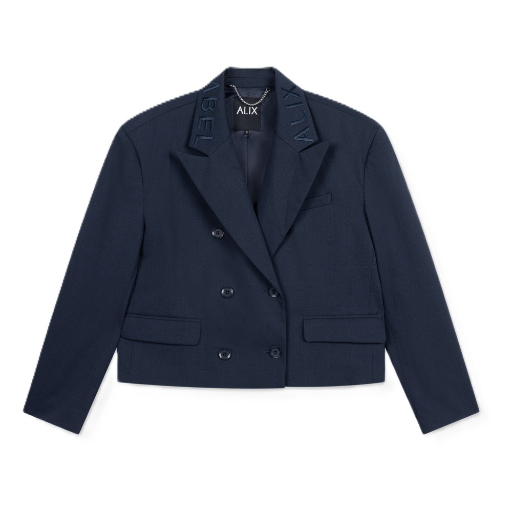 Deze navyblauwe blazer van Alix The Label is een verfijnde klassieker met een eigentijdse twist. Het dubbele knoopsluiting, de schoudervullingen en de lange mouwen zorgen voor een gestructureerde en flatterende pasvorm. Het 'ALIX THE LABEL' borduursel op de kraag en het stierenborduursel op de rug voegen een subtiel, maar krachtig detail toe aan het ontwerp.