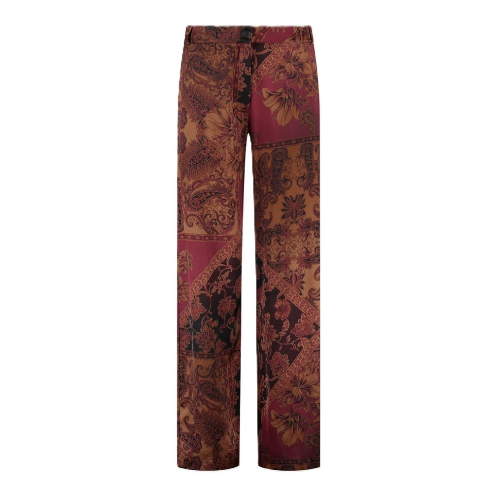 Voeg een vleugje verfijning toe aan je garderobe met de Anne Pants van Amaya Amsterdam. Deze broek combineert een rijke paisleyprint in diepe bordeaux- en bruintinten met een licht glanzende viscose stof, wat resulteert in een elegante en vrouwelijke uitstraling. De rechte, uitlopende pasvorm biedt zowel comfort als stijl, waardoor deze broek geschikt is voor diverse gelegenheden. Met twee praktische steekzakken en een discrete ritsluiting is de Anne Pants zowel functioneel als modieus.