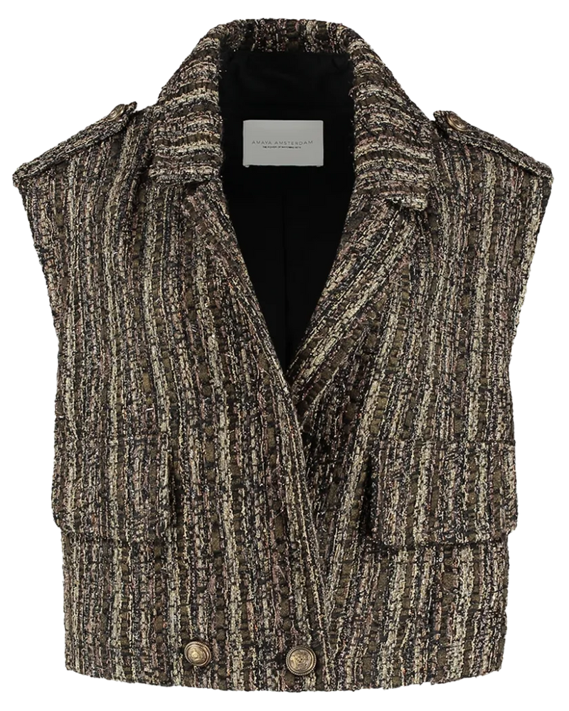 De Amaya Amsterdam Day Gilet in Brown is een echte eyecatcher met een luxueuze, eigentijdse uitstraling. Dit prachtige gilet is uitgevoerd in een bouclé stof met verschillende kleurnuances, wat zorgt voor een unieke en rijke textuur. Dankzij de licht losse pasvorm oogt het gilet moeiteloos stijlvol en draag je het makkelijk over een blouse, trui of jurk.