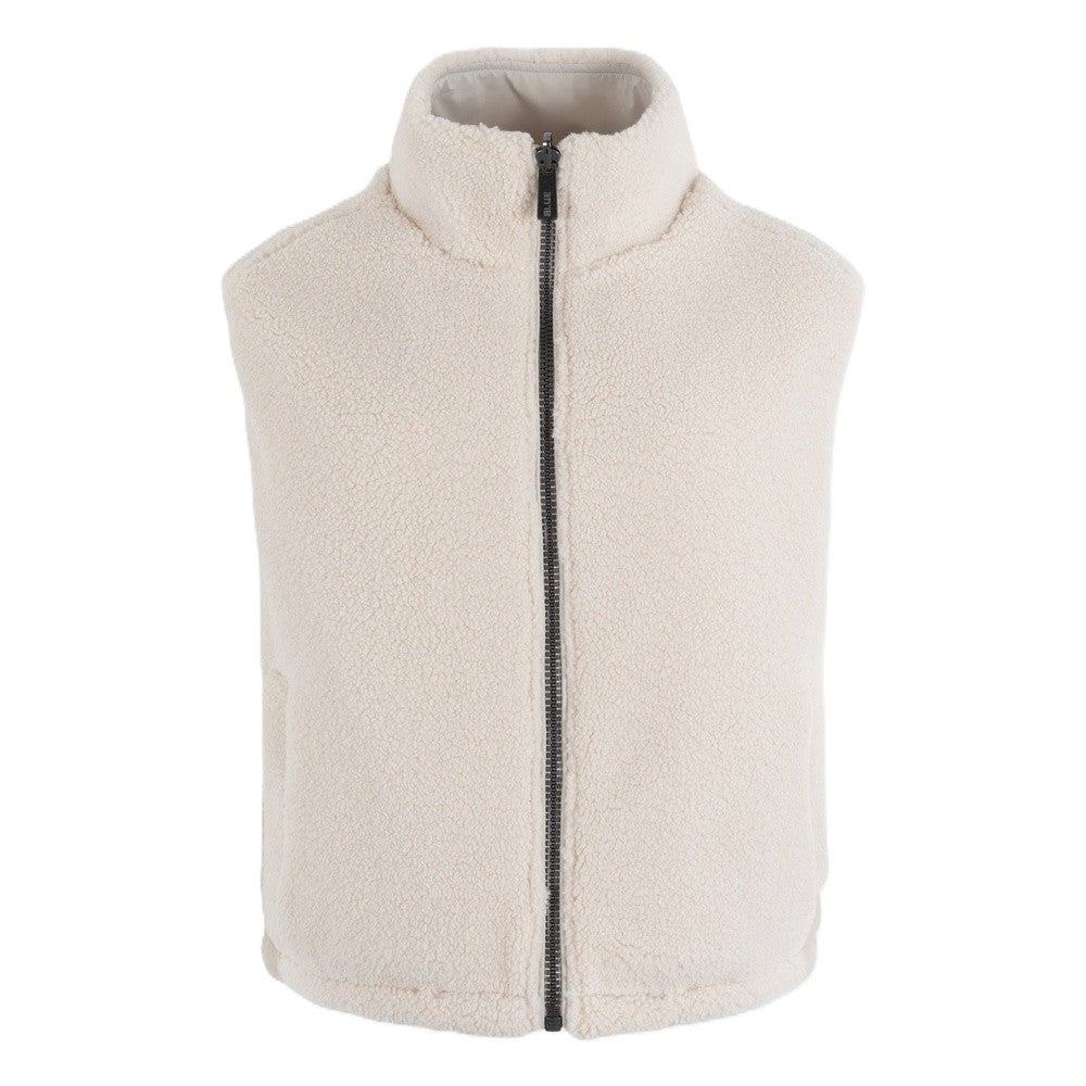 De Anna Blue bodywarmer in de kleur kit is een stijlvolle musthave voor het winterseizoen. De zachte teddylook zorgt voor een cozy uitstraling, terwijl het omkeerbare design (reversible) zorgt voor extra variatie — je hebt twee looks in één item! De bodywarmer is gevoerd met gerecycled polyester en heeft een buitenzijde van duurzaam polyamide. Dankzij de ritssluiting en de praktische steekzakken is dit item niet alleen modieus, maar ook functioneel en comfortabel. Perfect om te dragen over een trui of longsleeve tijdens koude dagen. Het model is 175cm en draagt een 36.