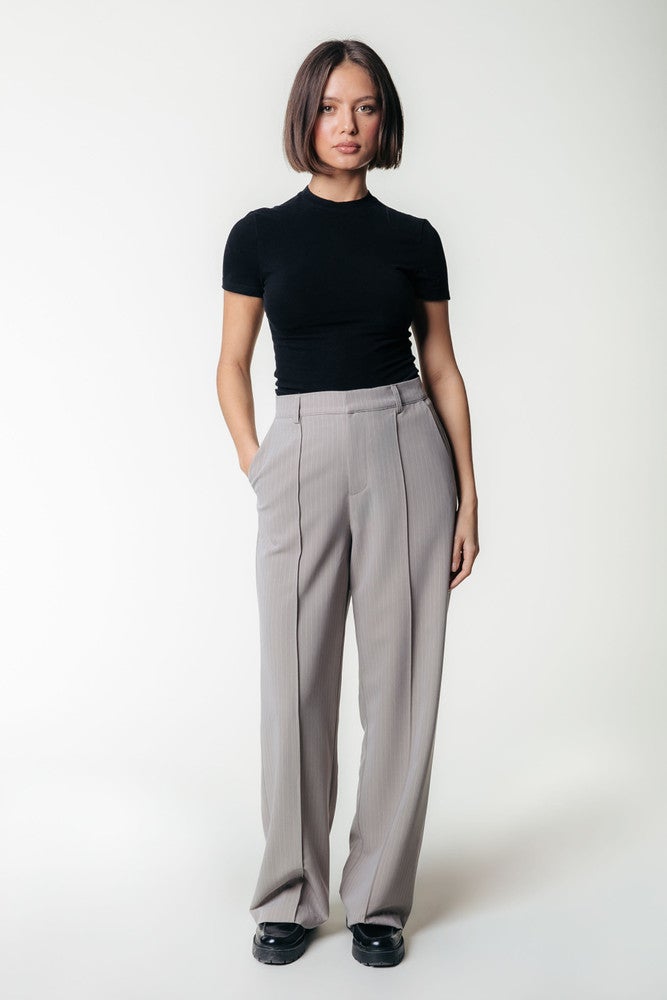 De subtiele pinstripes geven de broek een chique touch, terwijl de elastische taille en handige steekzakken zorgen voor een ontspannen en praktische pasvorm. Combineer met een blouse voor een nette outfit of een casual T-shirt voor een relaxte look. Dankzij de klassieke snit en veelzijdige kleur is dit item een echte must-have voor elke vrouw die stijl en comfort wil combineren. Het model is 171cm en draagt een 36.