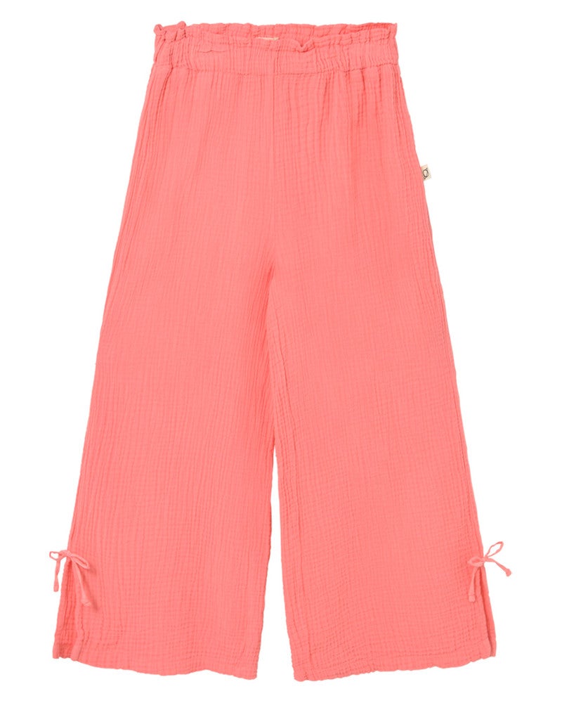 Deze wijde Cozmo broek is gemaakt van luchtige, zachte katoen en voelt heerlijk comfortabel aan. De elastische taille met ruches zorgt voor een speels accent, terwijl de zijsplitten met strikjes een extra lief detail toevoegen. Perfect voor zomerse dagen vol speelplezier en beweging.