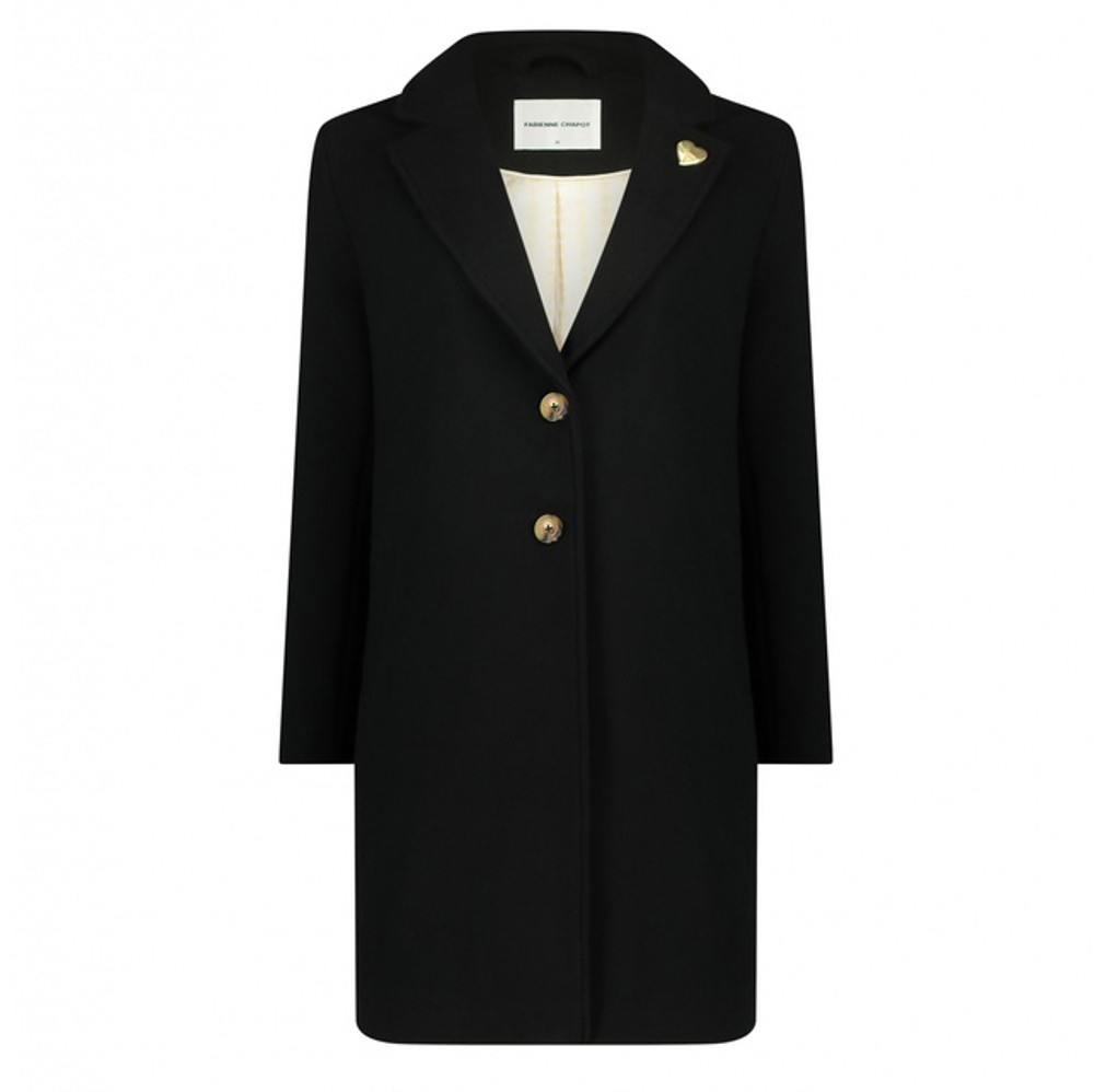 Deze zwarte jas is een echte klassieker. Met een knoopsluiting en gouden hartspeld op de kraag straal je klasse uit. Must-have voor je wintergarderobe!