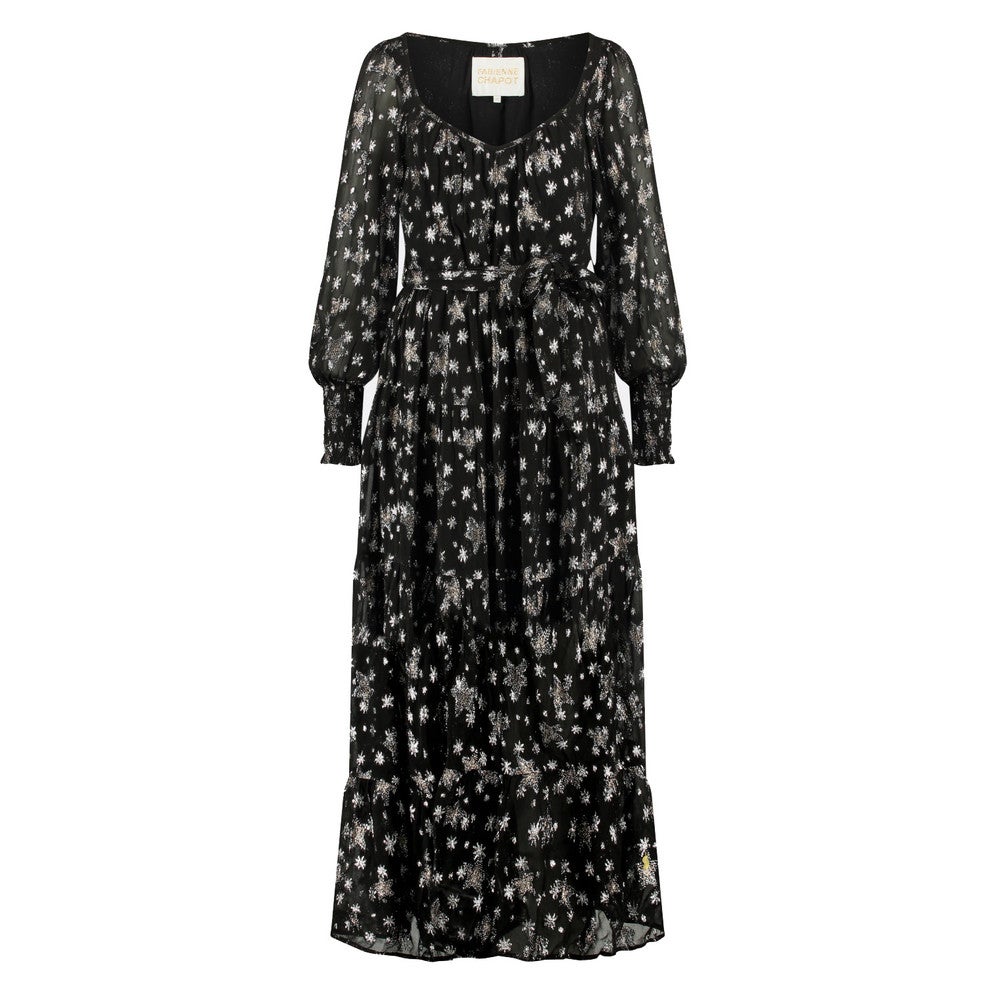 Lange, elegante jurk met strikcenuur bj de taille. Folie Dress heeft ballon mouwen met gesmokte mancheten en all-over "Starfleet" print
