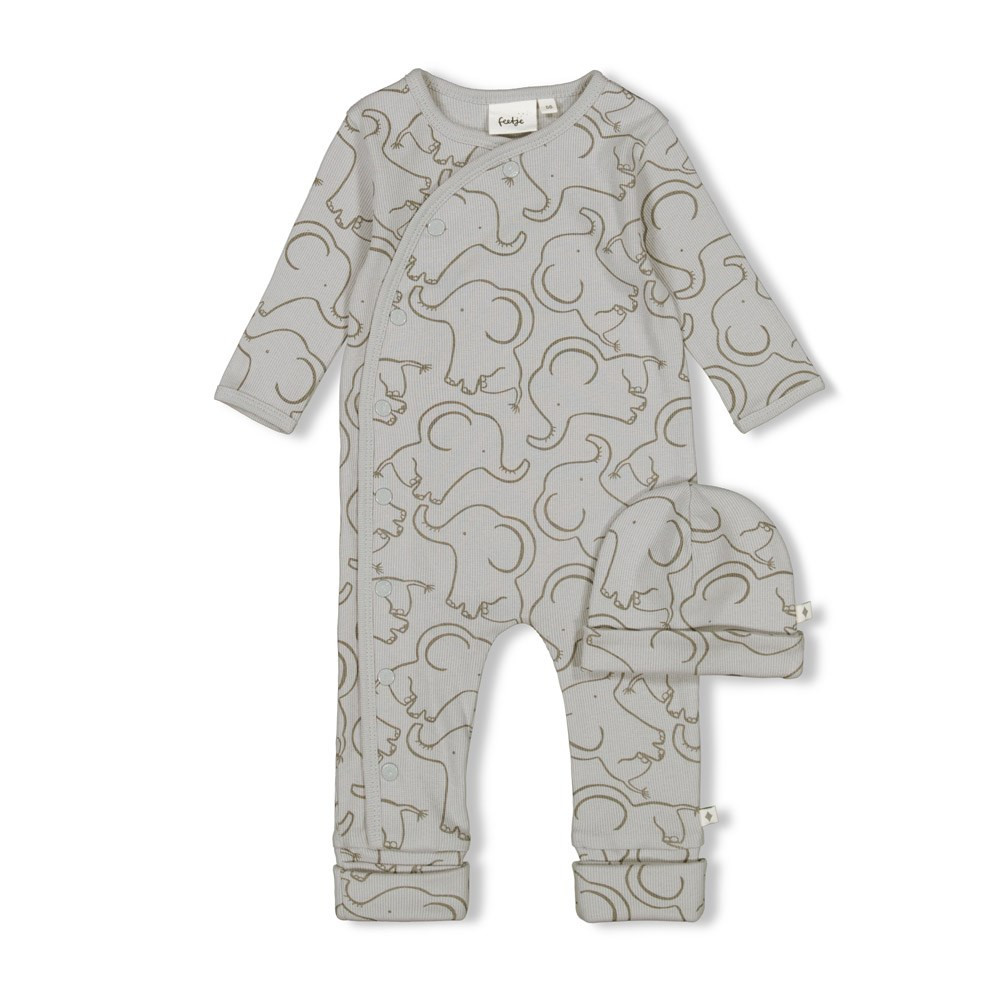 Deze Feetje Geschenkset Boxpak met Muts – Elephant in grijs is het perfecte cadeau voor een pasgeboren baby. Het schattige olifantenprint op het boxpak maakt het een liefdevolle en vrolijke set. Het zachte, ademende materiaal zorgt voor ultiem comfort, terwijl het boxpak en de bijpassende muts je kleintje warm houden. Het praktische ontwerp maakt het makkelijk om je baby aan- en uit te kleden, en de set komt in een mooie geschenkdoos, waardoor het een ideaal cadeau is voor een babyshower of als kraamcadeau.