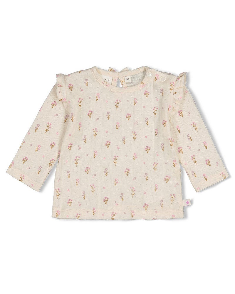 De Feetje longsleeve pointelle rib AOP Flower Ranch off‑white is een zachte en comfortabele longsleeve voor baby’s met een vrolijk bloemen‑dessin dat direct een speelse touch aan elke outfit geeft. De fijne ribstructuur voelt prettig aan en maakt deze longsleeve perfect voor dagelijks gebruik, van kruipen tot spelen en knuffelmomenten. Door het frisse all‑over‑printje oogt de outfit altijd vrolijk en stijlvol. Deze Feetje longsleeve pointelle rib AOP Flower Ranch off‑white laat zich makkelijk combineren met een legging, broekje of short. Of je nu kiest voor een casual everyday outfit of een frisse lente‑set, deze longsleeve vormt een veelzijdige basis waar je telkens leuke combinaties mee maakt. Met dit item geef je je kleintje een comfortabele en modieuze outfit die er niet alleen schattig uitziet, maar ook heerlijk draagt bij allerlei dagelijkse avonturen.