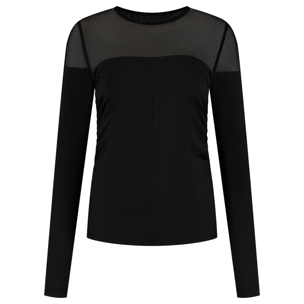 Mooie aansluitende top met mesh bovenkant. Aan de achterkant zit een ritssluiting. De top bevat stretch.