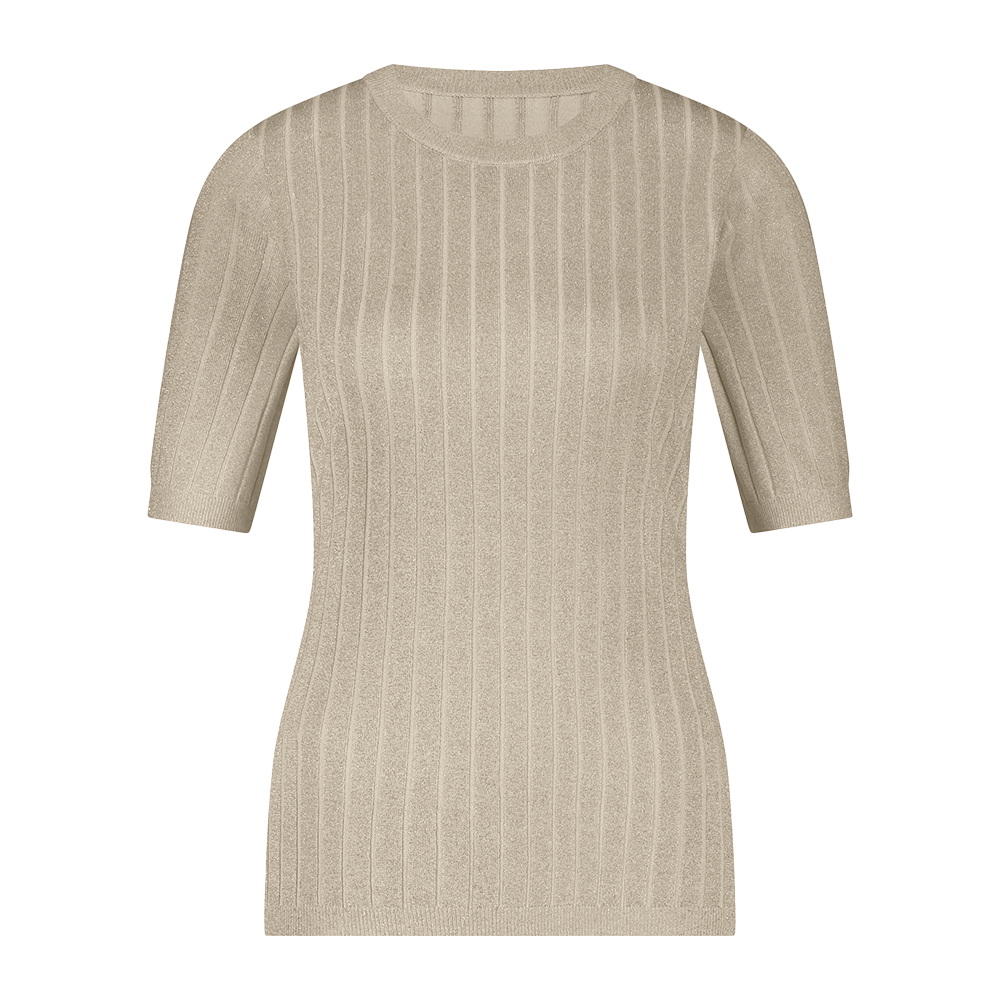 De Fifth House Gracelyn Top in goud heeft een geribbelde stof met subtiele glitters, waardoor deze top zowel stijlvol als veelzijdig is. De ronde hals en aansluitende pasvorm zorgen voor een elegante uitstraling, terwijl de normale stretch voor comfort zorgt. Perfect te combineren voor zowel casual als chique outfits. Het model is 179 cm en draagt maat 36