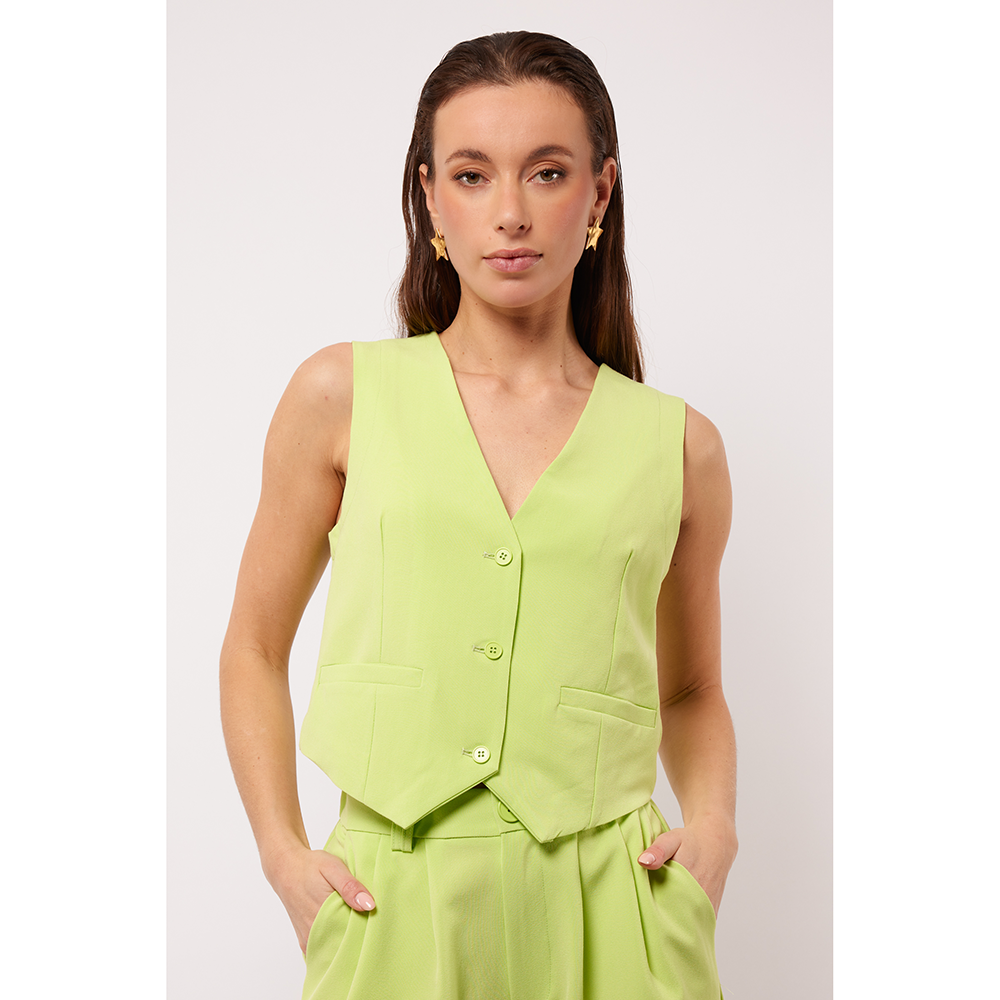 Voeg een stoere touch toe aan je outfit met het Bodi Gilet in groen van FLURESK. Dit mouwloze gilet heeft een opvallende knoopsluiting en is gemaakt van 100% polyester, wat zorgt voor een comfortabele pasvorm. De groene kleur geeft een frisse en moderne uitstraling aan je look. Het model is 174cm en draagt een 36.
