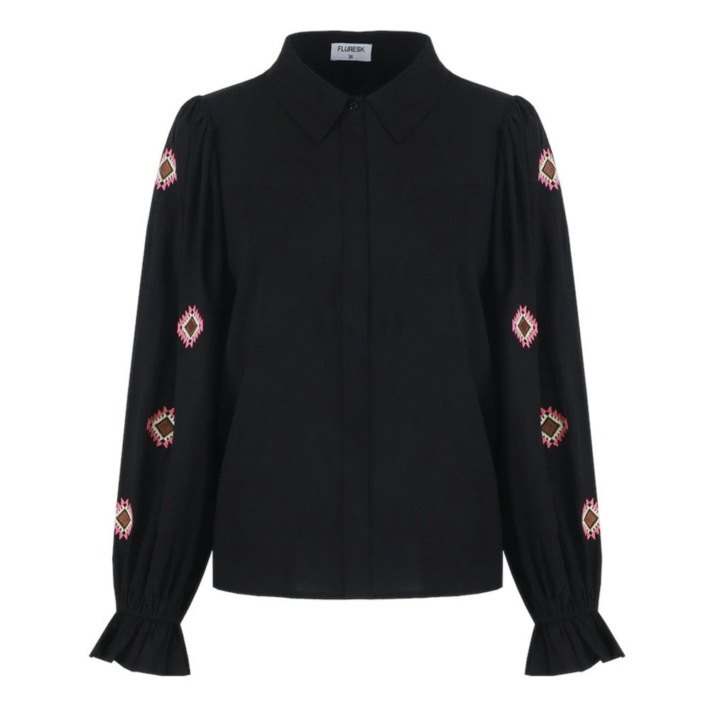 De Fluresk Fayra Blouse in zwart met roze borduurwerk is een verfijnde en vrouwelijke toevoeging aan je garderobe. Deze blouse combineert klassieke boho-elementen met een moderne flair, waardoor hij veelzijdig inzetbaar is voor verschillende gelegenheden.