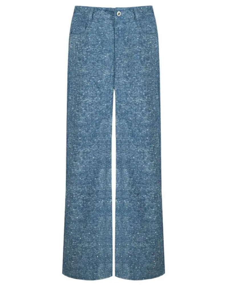 De Fluresk Rain Pants is een opvallende keuze voor wie graag een trendy en feestelijke look neerzet. Deze broek van Fluresk heeft een wide leg fit en is gemaakt van een glitter blue denimlook stof die zacht en stretchy aanvoelt. Het subtiel glinsterende effect geeft elke outfit een vleugje glamour en maakt de broek geschikt voor een avond uit of een speciaal event. Draag de Rain Pants samen met de Lucy Jacket van Fluresk om een complete outfit te creëren die als één geheel oogt en echt een fashion statement maakt. Met deze broek voeg je een modern item toe aan je garderobe dat je keer op keer opnieuw wilt stylen. Dit item valt op maat.