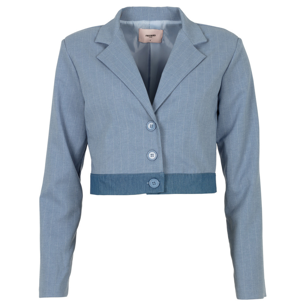 Deze stijlvolle korte blazer in blauw combineert een klassieke pinstripe crêpe stof met een subtiel katoenen contrast voor een verfijnde en moderne uitstraling. De lange mouwen en knoopsluiting zorgen voor een tijdloze look, terwijl de contrasterende stof aan de onderzijde een speelse twist toevoegt.