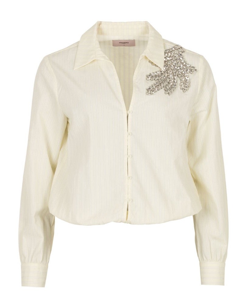 De klassieke kraag, knoopsluiting en lange mouwen geven de blouse een tijdloze basis, terwijl het elastische detail aan de onderzijde zorgt voor een vrouwelijke fit.
