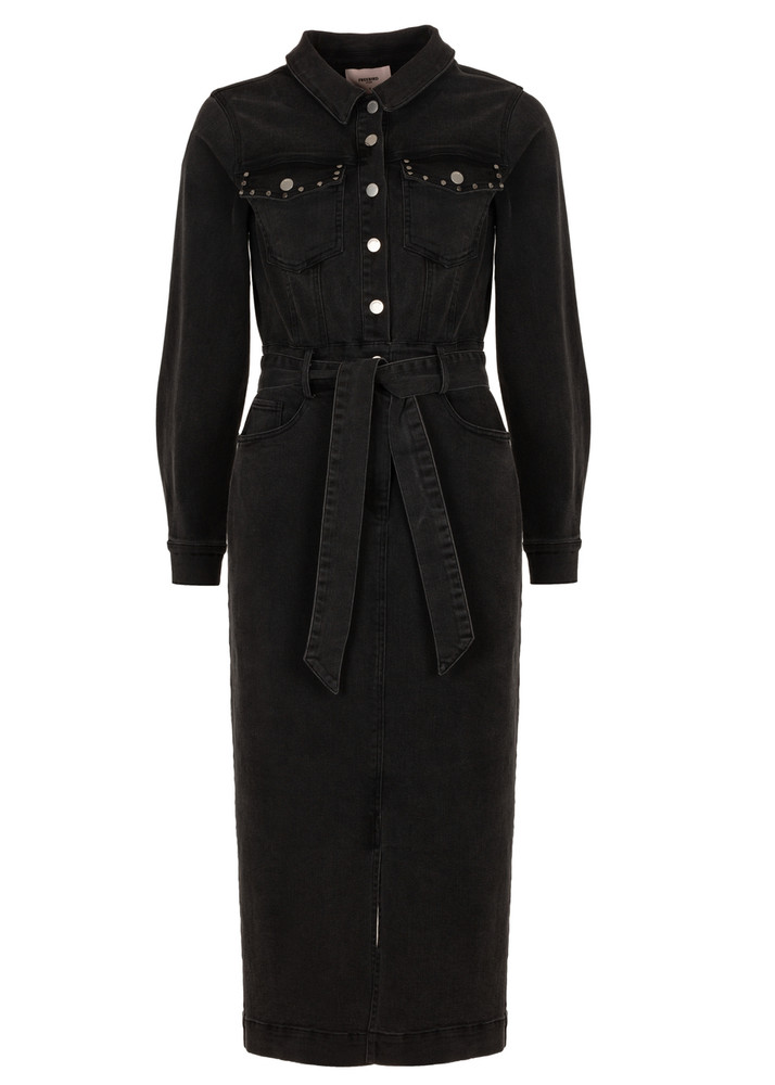 Maak een krachtige indruk met deze zwarte Danya midi-jurk van denim met stretch van Freebird. Het stevige denim combineert structuur met comfort, waardoor de jurk zowel flatterend als prettig draagbaar is. De aangesloten pasvorm accentueert je silhouet, terwijl de strikceintuur in de taille je figuur elegant benadrukt.