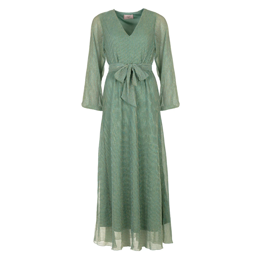 De Deli Dress van Freebird is de ultieme keuze voor een stijlvolle avond vol elegantie. Deze maxi jurk in jadegroen is gemaakt van een soepel vallende plisséstof met een subtiele lurex glans, waardoor je outfit direct een feestelijke uitstraling krijgt. De prachtige glinstering in de stof vangt het licht op een subtiele manier – perfect voor bijzondere gelegenheden.