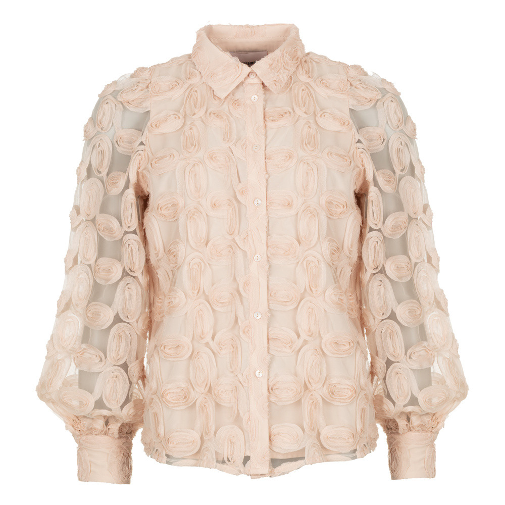 Voeg een vleugje verfijning toe aan je garderobe met de Kendall blouse van Freebird in de elegante champagnekleur. Deze blouse is een ware blikvanger dankzij de delicate 3D-bloemenstructuur die subtiel op de luchtige meshstof is geweven. De ballonmouwen met manchetten geven de blouse een romantische en vrouwelijke uitstraling, terwijl de klassieke kraag en knoopsluiting zorgen voor een tijdloze afwerking.