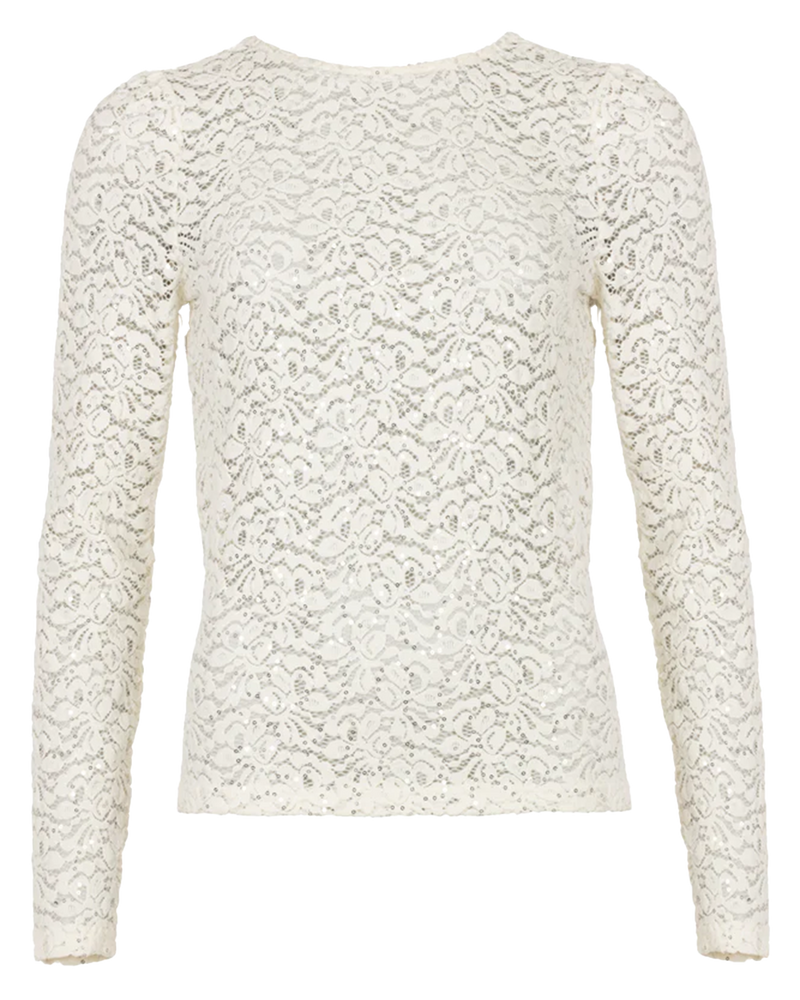 Voeg een vleugje verfijning toe aan je garderobe met de Tiana LS Top van Freebird in off-white. Deze elegante top is vervaardigd uit een zachte jersey velours lace stof met stretch, waardoor hij comfortabel draagt en mooi aansluit op het lichaam. De subtiele zilveren pailletten zorgen voor een delicate glans, wat het ontwerp een luxe touch geeft.