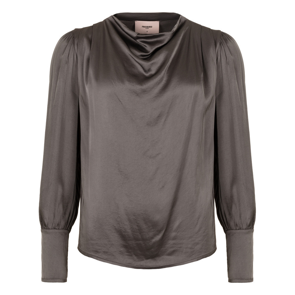 De Teske Top LS in Iron van Freebird is een elegante top met lange mouwen, vervaardigd van glanzende viscose met een vleugje stretch. De top valt soepel langs het lichaam en de watervalhals zorgt voor een chique, flatterend effect. Perfect te dragen bij zowel zakelijke gelegenheden als feestelijke avonden. Het model is 175cm en draagt een 36.