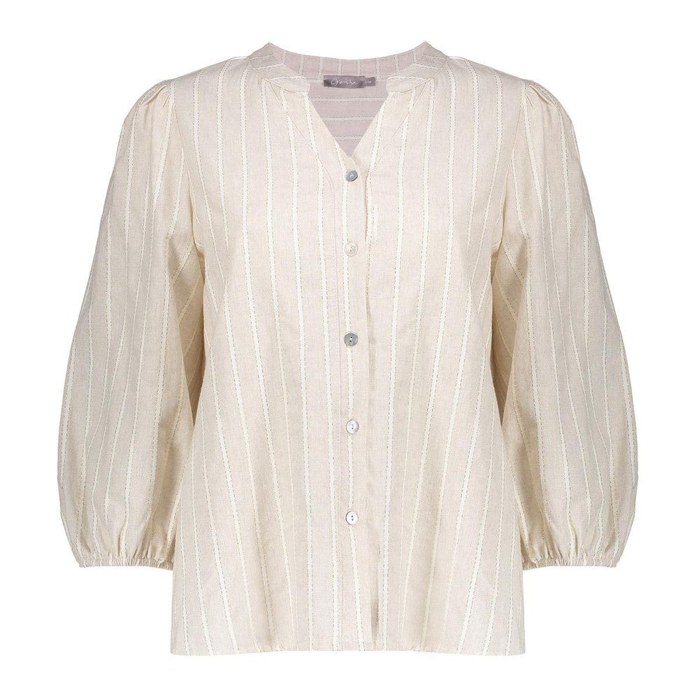 De Geisha blouse lurex stripe ecru is een stijlvolle dames blouse met een verfijnde strepenprint en subtiel lurex detail, wat zorgt voor een moderne en elegante uitstraling. Deze Geisha blouse heeft een flatterende pasvorm en is ideaal om je outfit een sprankelend accent te geven. Dankzij het tijdloze design is deze Geisha blouse met lurex stripes perfect voor zowel casual als geklede looks. Combineer deze Geisha blouse met de bijpassende Geisha shorts lurex stripe voor een trendy en complete outfit. De combinatie van de gestreepte blouse en de shorts met lurex streep geeft een frisse, zomerse look die uitermate geschikt is voor een dagje uit, vakantie of een gezellige lunch met vrienden.