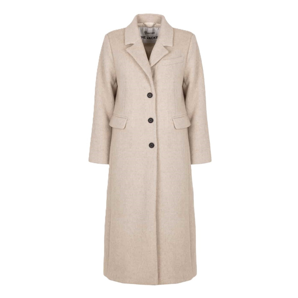 De jas is voorzien van een reverskraag en een dubbele knoopsluiting, wat bijdraagt aan de verfijnde uitstraling. De lange mouwen en de knielange lengte maken hem ideaal om warm te blijven zonder in te leveren op stijl. Het model is 178cm n draagt een 38.