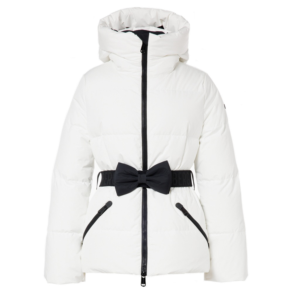Qua functionaliteit biedt de Bowy Ski Jacket praktische details zoals twee zijzakken, twee binnenzakken en een mouwzakje voor een skipas. De jas heeft een vaste capuchon en een afneembare sneeuwvanger voor extra bescherming tegen de elementen. De gebreide manchetten aan de binnenkant van de mouwen helpen de warmte binnen te houden. Een opvallend kenmerk is de dubbele riem, die de taille accentueert en een modieuze uitstraling geeft.