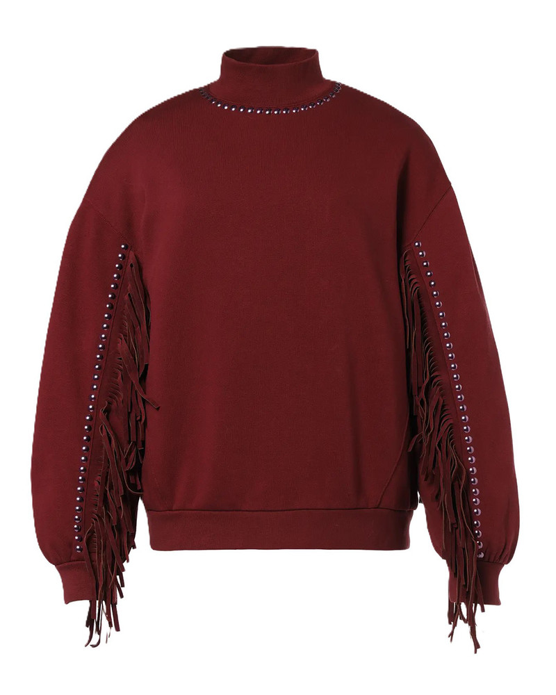 De sweater valt op door de franjes langs de mouwen en de subtiele studs bij de schoudernaden en halslijn, die een edgy maar verfijnde uitstraling geven. Het geribde boord aan de taille, mouwen en hals zorgt voor een perfecte pasvorm, terwijl de garment dye en wash een unieke, gedragen look creëren. Aan de zijkant prijkt een geweven merklabel, dat het design een herkenbare touch geeft.