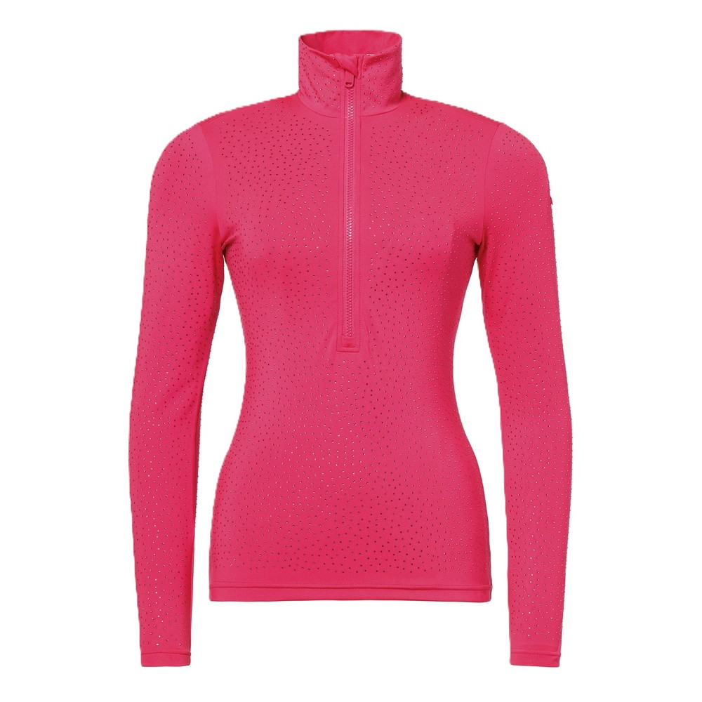 De strakke, aansluitende pasvorm van de Gianna Ski Pully zorgt ervoor dat hij perfect onder een ski-jacket gedragen kan worden, zonder extra volume toe te voegen. De pully is gemaakt van een geavanceerde power-stretch interlock-stof met een zacht geborstelde binnenkant, wat zorgt voor optimale bewegingsvrijheid en een comfortabel gevoel op de huid. Het materiaal is technisch zeer sterk: het reguleert vocht op efficiënte wijze, droogt snel en beschikt over een anti-geurtechnologie, waardoor het ideaal is voor lange en intensieve dagen in de sneeuw. De verfijnde afwerking met subtiele ton-sur-ton strass-steentjes geeft een elegante glans zonder te overdrijven, waardoor de pully ook uitermate geschikt is voor après-ski of andere winterse gelegenheden. Tot slot maken de praktische details, zoals de langere half-ritssluiting voor extra ventilatie en het metalen merkembleem op de bovenmouw, het ontwerp helemaal compleet.