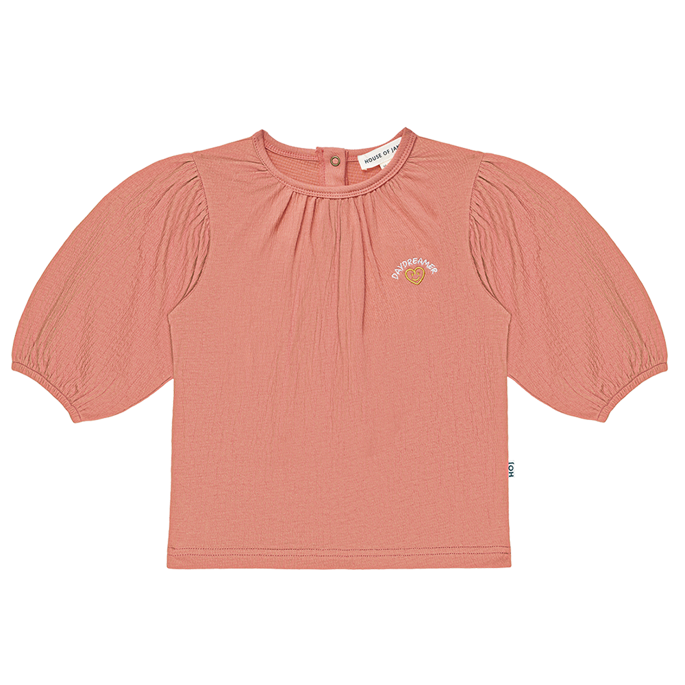 Top met pofmouwen en een ronde halslijn. Driekwart mouwlengte.