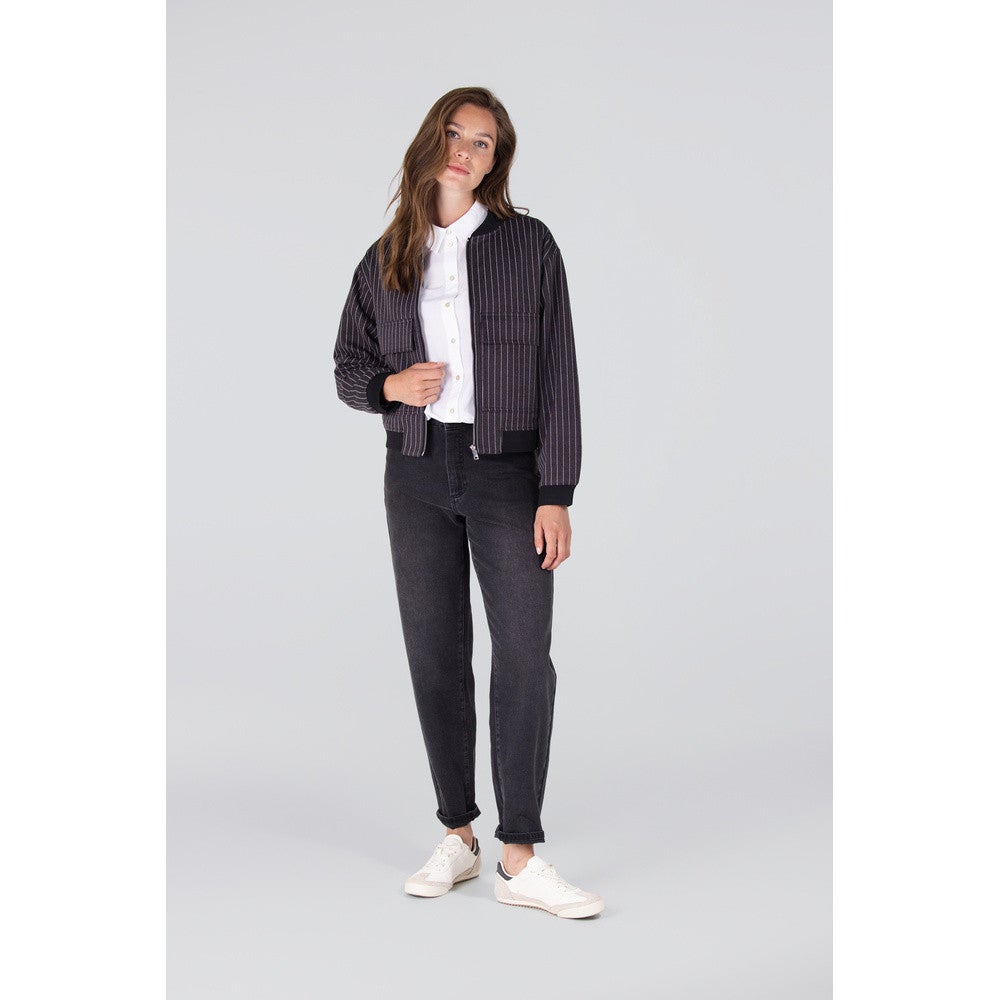 Het Honey bomberjack van Jansen Amsterdam geeft de klassieke krijtstreep een verrassend moderne draai. Dit oversized jasje in antraciet met witte strepen heeft een eigentijdse uitstraling die zowel stijlvol als stoer oogt. De zwarte ribboorden langs de mouwen en zoom zorgen voor een sportieve afwerking, terwijl de oversized pasvorm een nonchalante, urban vibe toevoegt.