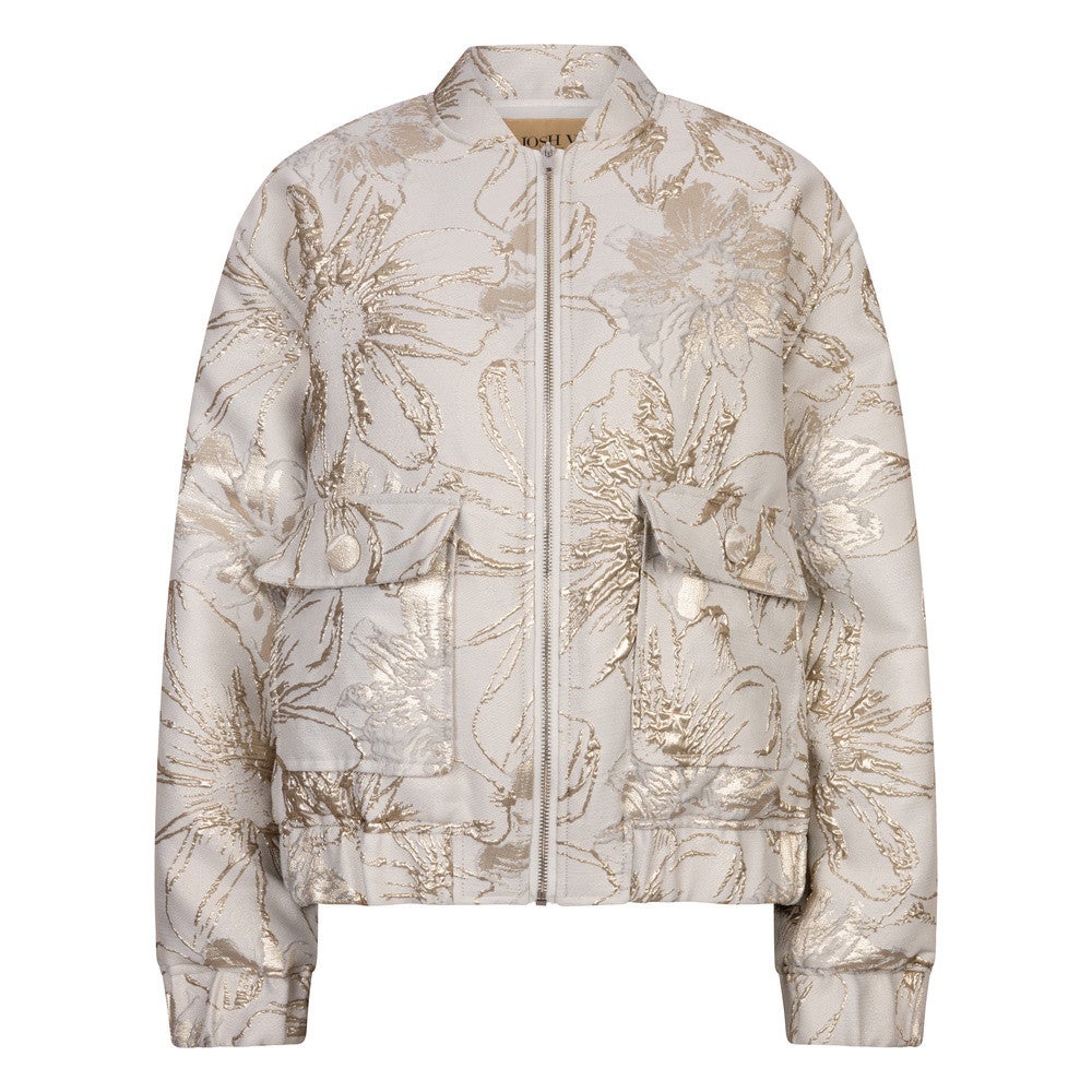 Het Kelsey bomberjack van JOSH V is een opvallend item dat iedere outfit direct een fashion statement maakt. Dit jasje in stone silver is uitgevoerd in een jacquard geweven bloemenprint en verrijkt met subtiele metallic details voor een luxe uitstraling. De oversized pasvorm zorgt voor een nonchalante, moderne look, terwijl de elastische band aan de onderzijde en mouwen een perfecte afwerking biedt. Voorzien van een JOSH V-branded ritssluiting en twee praktische zakken, combineert het bomberjack stijl met functionaliteit. Draag het met een basic top, jeans en hakken voor een casual-chique ensemble dat indruk maakt. Het model is 177cm en draagt een 36.