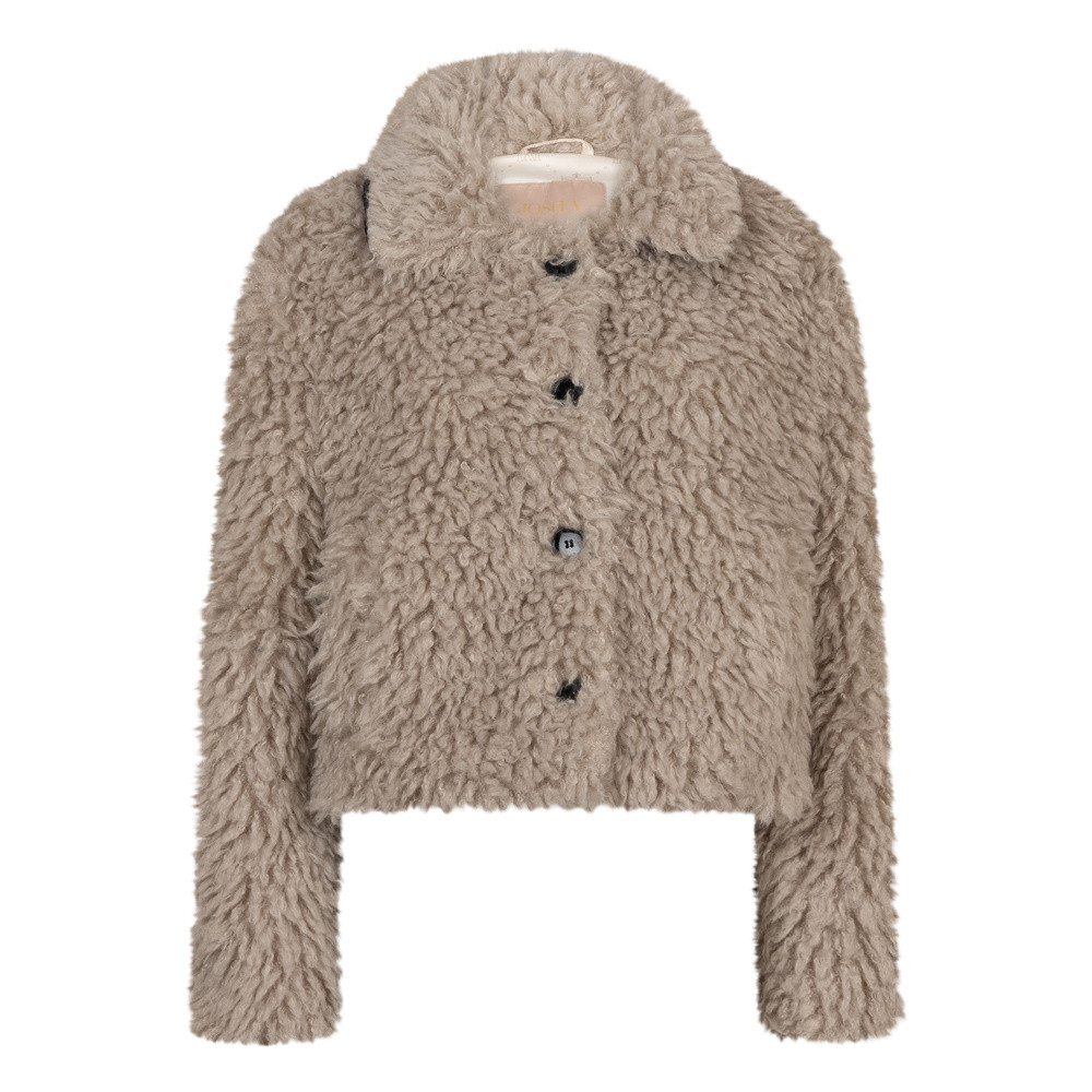 De Lisa coat van JOSH V is een stijlvolle must-have voor dames dit seizoen. Deze korte, boxy faux fur teddy jas in warm grey combineert een luxe uitstraling met optimaal draagcomfort. Gemaakt van gerecycled polyester, is hij een duurzame keuze die zacht en knuffelachtig aanvoelt.