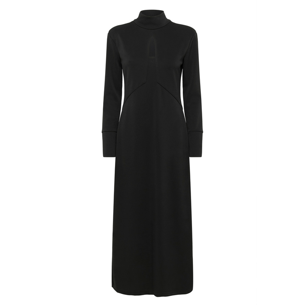 Een opvallend ovaal detail op de borst geeft de jurk een chique twist en trekt subtiel de aandacht, terwijl de slimme naden het silhouet flatterend vormen. Deze jurk is perfect voor zowel formele gelegenheden als stijlvolle dagelijkse looks, dankzij de comfortabele pasvorm en het tijdloze ontwerp.