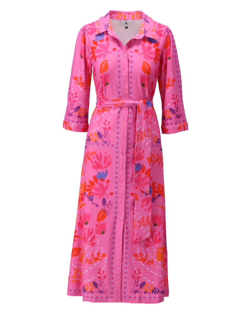 Deze dames jurk is een absolute eyecatcher die elke garderobe opfleurt. Het ontwerp kenmerkt zich door een speelse en kleurrijke print. Dankzij de klassieke kraag en de doorlopende knoopsluiting aan de voorzijde krijgt de jurk een tijdloze en verzorgde look die geschikt is voor diverse gelegenheden. De driekwart mouwen maken dit item ideaal voor verschillende seizoenen, terwijl het bijpassende strikceintuur in de taille de mogelijkheid biedt om een vrouwelijk en gedefinieerd silhouet te creëren.