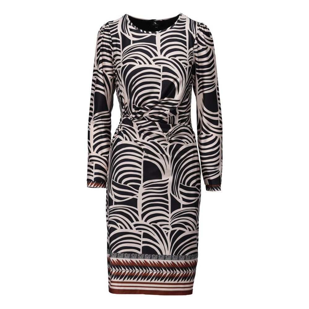 Deze jurk van K-Design is een stijlvolle keuze voor elke gelegenheid. De grafische print in neutrale tinten zorgt voor een moderne uitstraling, terwijl het twistdetail in de taille een flatterend silhouet creëert. Dankzij de aangesloten pasvorm en ronde halslijn is dit een jurk die elegantie en comfort moeiteloos combineert.