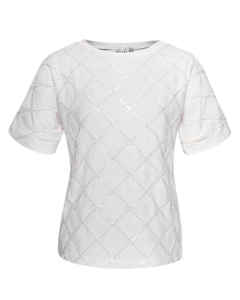 Deze prachtige witte top van het merk Kimara is een verfijnde toevoeging aan je garderobe die moeiteloos een vleugje glamour aan je dagelijkse look toevoegt. Het kledingstuk valt direct op door het gedetailleerde ruitpatroon dat over het gehele voorpand is aangebracht, waarbij de lijnen subtiel zijn geaccentueerd met glinsterende pailletten. Deze fonkelende details vangen het licht bij elke beweging, waardoor de top een luxe uitstraling krijgt zonder aan elegantie in te boeten. De Pien top is ontworpen met een klassieke ronde halslijn en korte mouwen, wat zorgt voor een tijdloos silhouet dat zowel comfortabel als flatterend is.