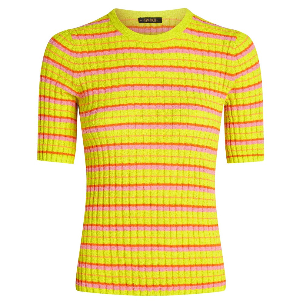 Laat je stralen met de King Louie Agnes Rib Top in zonnig neongeel – dé eyecatcher voor jouw zomergarderobe. Deze stijlvolle rib top voor dames is gemaakt van een comfortabele stretchstof met ribstructuur, waardoor hij perfect aansluit op je lichaam. De felle neongele kleur geeft je outfit een frisse, vrolijke uitstraling en is ideaal voor zonnige dagen. Met zijn ronde hals en korte mouwen is deze zomer top perfect te combineren met een high waist jeans, rok of short. Draag de King Louie top casual of gekleed en creëer moeiteloos een modieuze, opvallende look. Een echte must-have voor elke modeliefhebber! Het model is 1,75m en draagt maat 36.