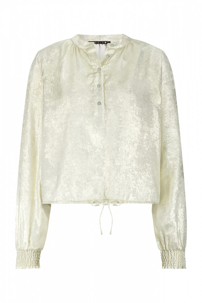 Maak je outfit compleet met een vleugje glamour met de Label Dot Alies Blouse in goud metallic. Deze stijlvolle blouse is een echte eyecatcher dankzij de glanzende metallic stof en verfijnde details.
