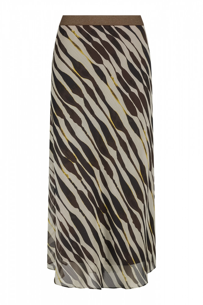 Ervaar moeiteloze chic met de Evelien rok in warm bruin-multi van Label Dot. Dankzij de diagonaal gesneden banen krijgt deze maxirok een beweging die zacht om je heupen valt – de perfecte stijl die meebeweegt bij elke stap. De volledige voering garandeert een aangenaam gevoel en voorkomt doorschijnen, waardoor je je zelfverzekerd voelt op elk moment van de dag.