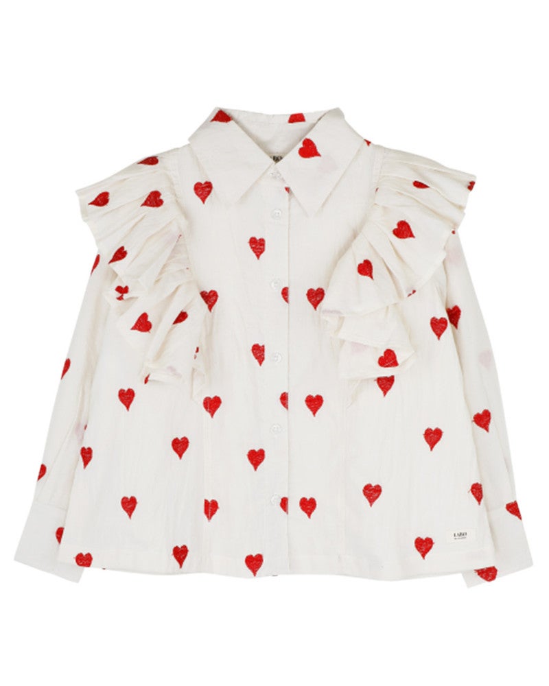 De Labo de Colores Loe Hearts Allover blouse is een schattige en stijlvolle toevoeging aan de meisjesgarderobe. Deze blouse heeft een lief hartjesprintje dat zorgt voor een speelse en vrolijke uitstraling. De klassieke kraag geeft het item een tijdloze look, terwijl de ruffels een extra girly en speels detail toevoegen. Perfect voor zowel een feestelijke gelegenheid als een stijlvolle dagelijkse outfit. Combineer de meisjes blouse met de bijpassende Labo de Colores Lana Hearts Allover rok voor een prachtige co-ord set. Samen vormen ze een charmante en trendy meisjes outfit die comfortabel zit en er tegelijkertijd super leuk uitziet. Ideaal voor school, een feestje of een dagje uit.