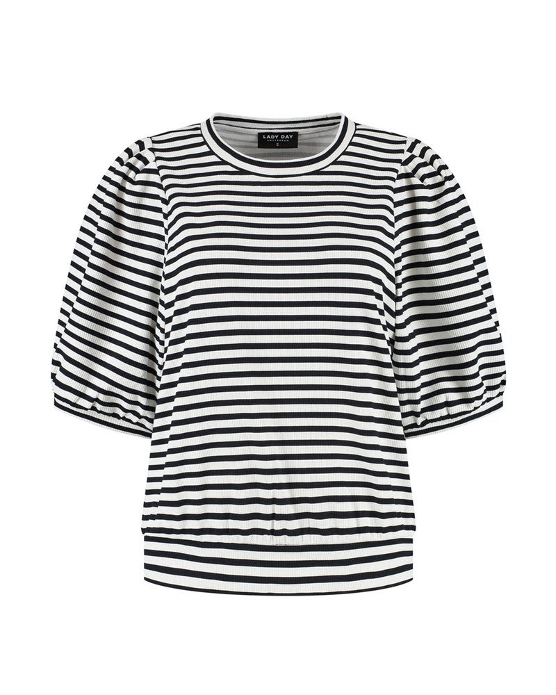 Het Lady Day Amie T‑shirt is een stijlvol dames T‑shirt met een klassiek gestreept patroon en een vrouwelijke twist. Het shirt heeft lichte pofmouwen die een subtiel speels detail toevoegen aan dit T-shirt, waardoor je outfit nét wat meer karakter krijgt dan een basic T‑shirt. Dankzij de ontspannen pasvorm draagt dit dames T‑shirt comfortabel en voelt hij prettig aan gedurende de dag. Het tijdloze streepdessin maakt dit item eenvoudig te combineren met allerlei bottoms. Draag het Amie T‑shirt met een jeans voor een casual, everyday look, of combineer het met een nette pantalon voor een chic‑casual outfit. Door het veelzijdige ontwerp is dit T‑shirt een waardevolle basis in je garderobe die je seizoen na seizoen met plezier draagt. Met het Lady Day Amie T‑shirt voeg je een fris en vrouwelijk item toe dat makkelijk te stylen is voor uiteenlopende gelegenheden.